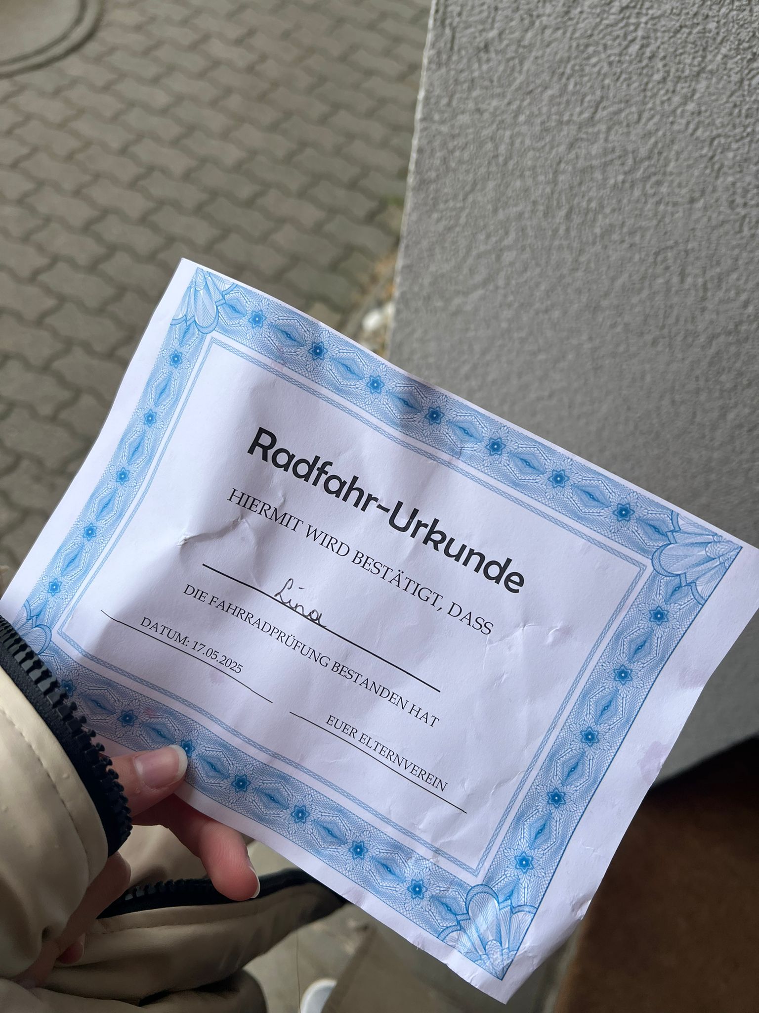 - Urkunde für die Fahrradprüfung in Gänserndorf